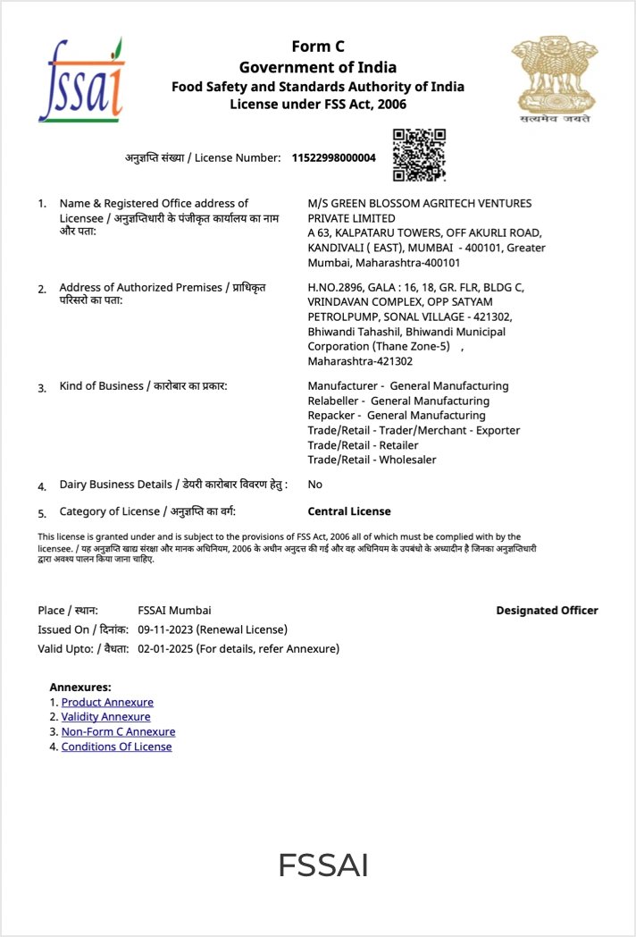 At Green Blossom Agritech, we are committed to maintaining the highest standards of quality, sustainability, and transparency. To ensure that our products, including our premium Makhana, meet these standards, we hold several certifications that affirm our dedication to excellence in agriculture and food safety.