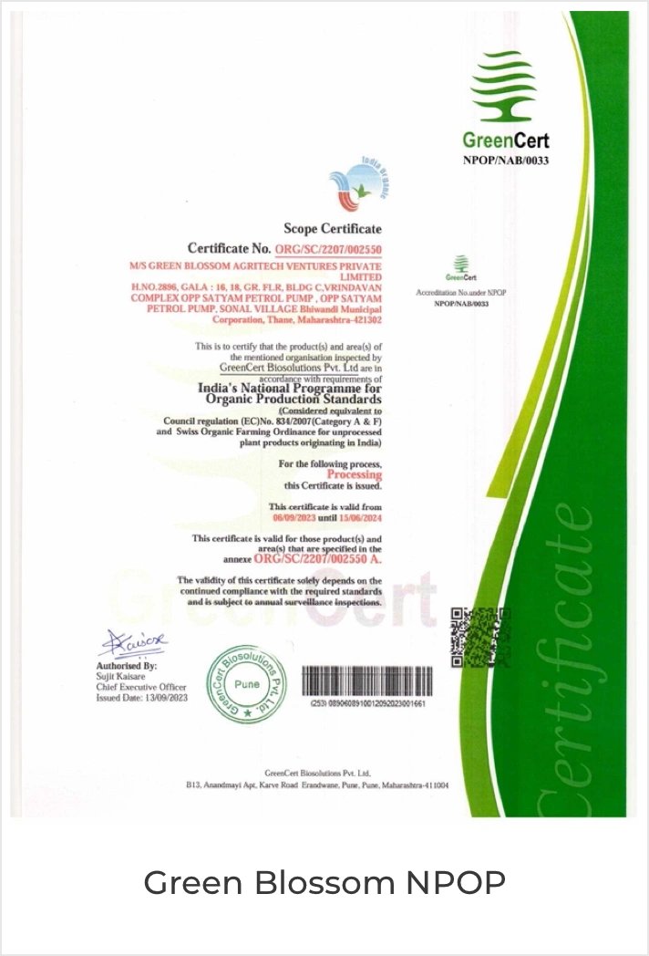 As a forward-thinking company, we also focus on enhancing the livelihoods of our farmers through education, support, and fair trade practices. At Green Blossom Agritech, we aim not only to provide nutritious and healthy products but also to contribute positively to the agricultural ecosystem in Maharashtra.